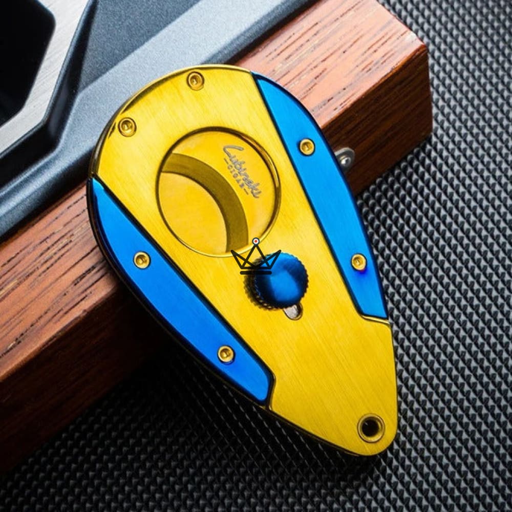 Mit seiner rechteckigen Silhouette aus Zinklegierung und Edelstahl fällt dieses Modell mit seinem zweifarbigen Finish in gebürstetem Gold und Saphirblau sofort ins Auge. Jedes Detail wurde für einen sauberen und symmetrischen Schnitt entwickelt, unabhängig vom Kaliber Ihrer Zigarre.