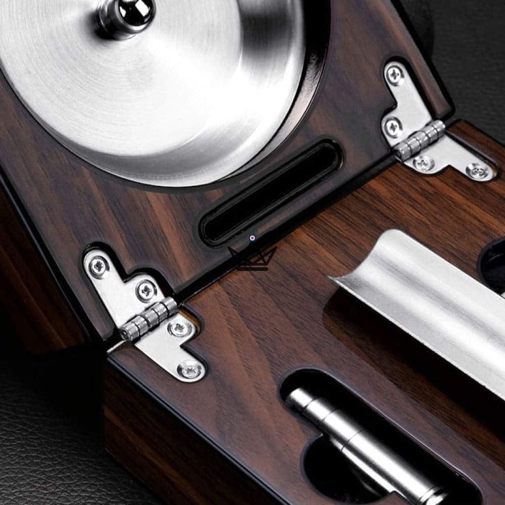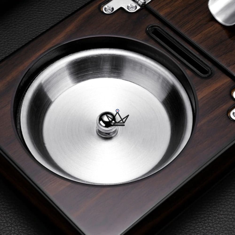 Der Zigarrenständer ermöglicht Ihnen das sichere Abstellen Ihrer Zigarre, während der Aschenbecher aus Stahl, der sich zur einfachen Reinigung leicht ausklipsen lässt, Ihrem Verkostungsraum einen Hauch von Eleganz verleiht.