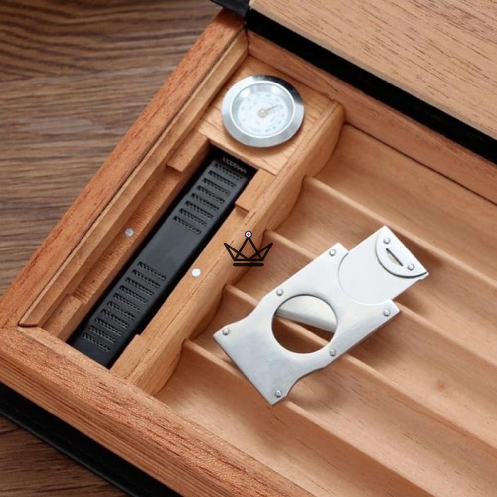 Im Lieferumfang sind ein Hygrometer, ein Zigarrenschneider, ein Luftbefeuchter, eine Dosierpipette und eine Schablone für 5 Zigarren enthalten.