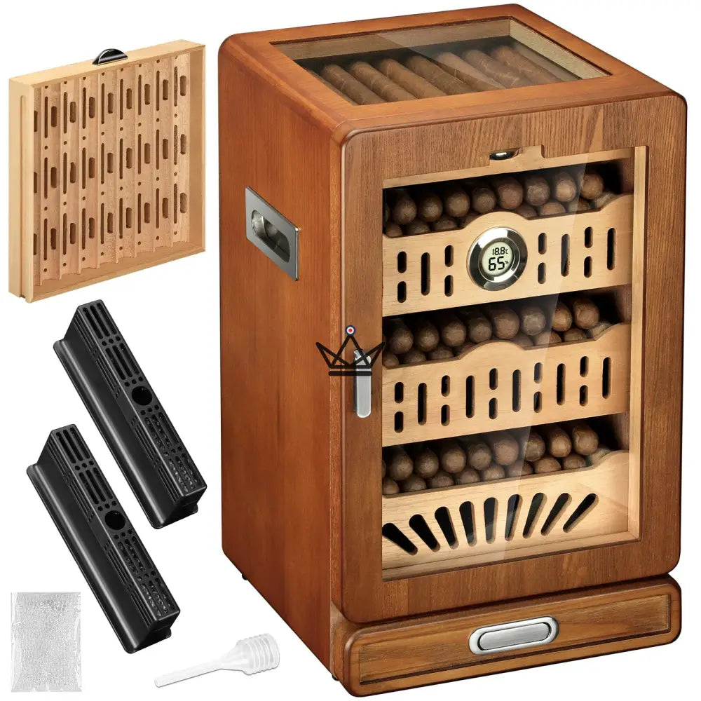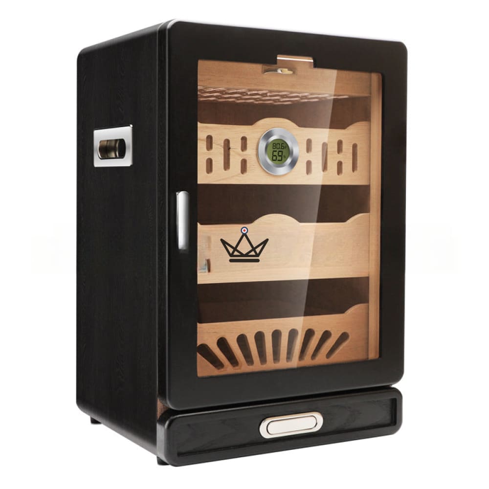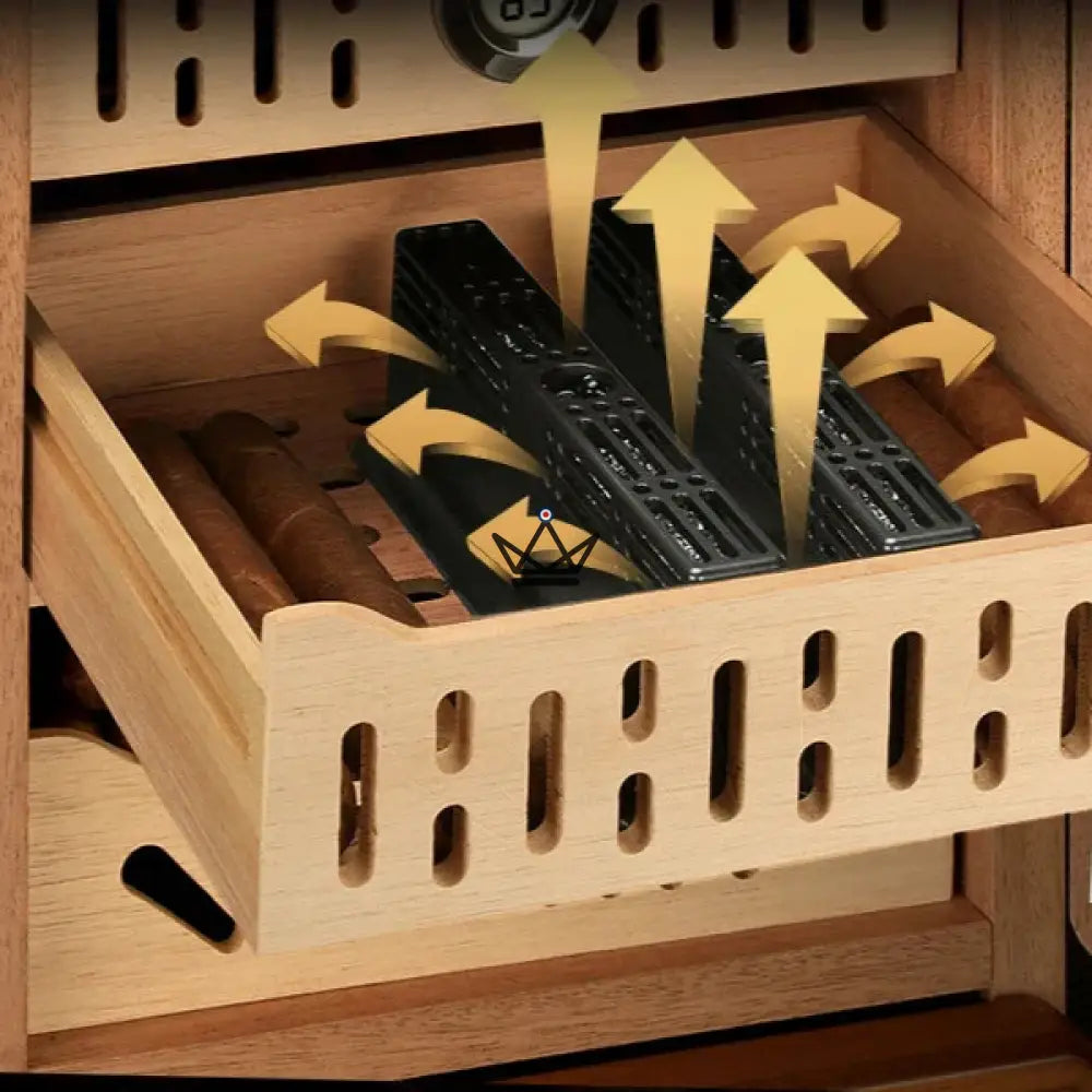 Der Vesuvius Sky wird mit zwei Kristallbefeuchtern und einer Zufuhrpipette geliefert und sorgt so für eine konstante Luftfeuchtigkeit zwischen 65 % und 75 % . Diese Konfiguration schützt Ihre Zigarren vor Umweltschwankungen und verstärkt gleichzeitig ihr Aroma, egal ob es sich um Davidoff- , Arturo Fuente- oder Oliva- Zigarren handelt.
