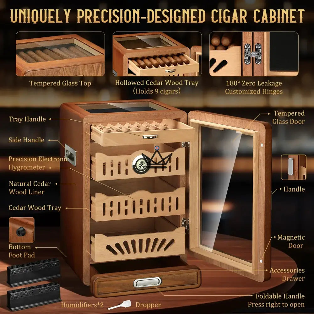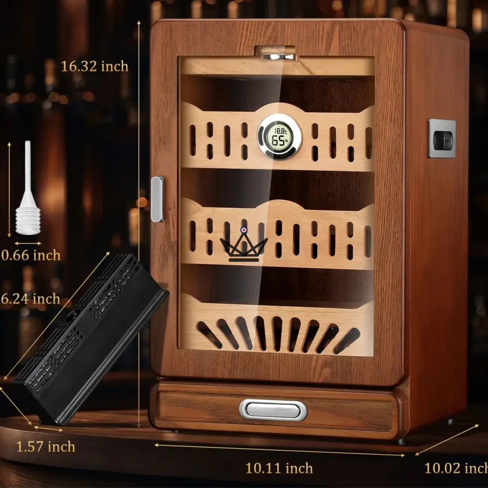 - Eingebautes elektronisches Hygrometer : Präzise Feuchtigkeitskontrolle, Anzeige durch die Glastür ablesbar.