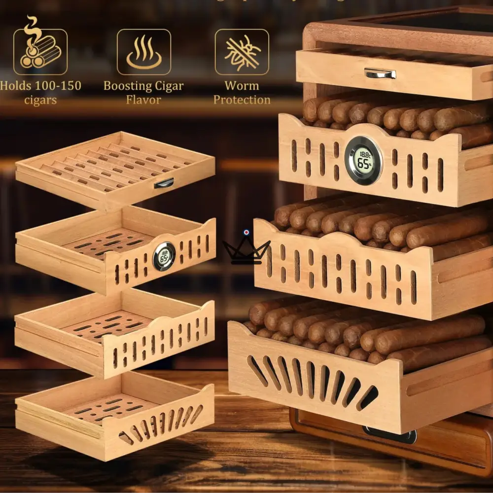 - Drei Innenschubladen aus natürlichem Zedernholz : Gesamtkapazität für 100 bis 150 Zigarren , mit optimierter Belüftung , um die Frische und das Aroma Ihrer H.Upmann- , Trinidad- und Bolivar- Zigarren zu bewahren.