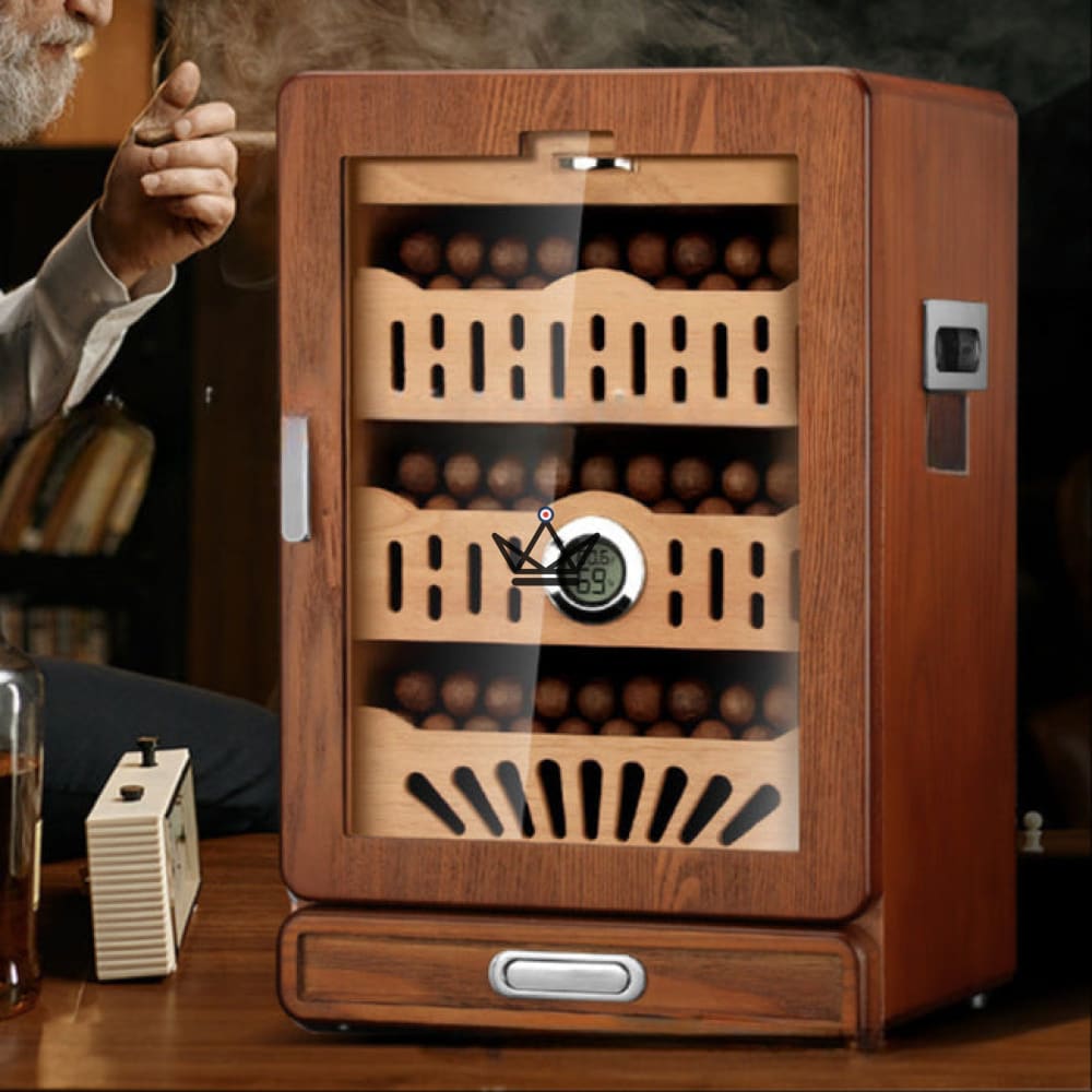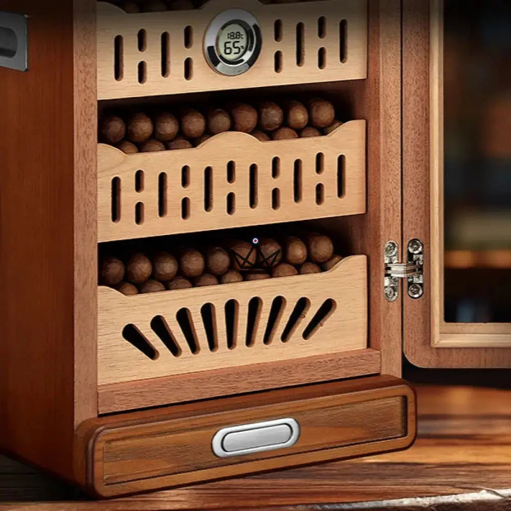 Darüber hinaus bietet die Tür aus gehärtetem Glas einen Blick auf die drei inneren Schubladen aus Zedernholz , von denen eine mit einem präzisen elektronischen Hygrometer ausgestattet ist. Dieses Hygrometer ist strategisch platziert, sodass es abgelesen werden kann, ohne dass der Humidor geöffnet werden muss . Auf diese Weise bleibt das ideale Feuchtigkeitsgleichgewicht für Ihre kubanischen Zigarren erhalten.