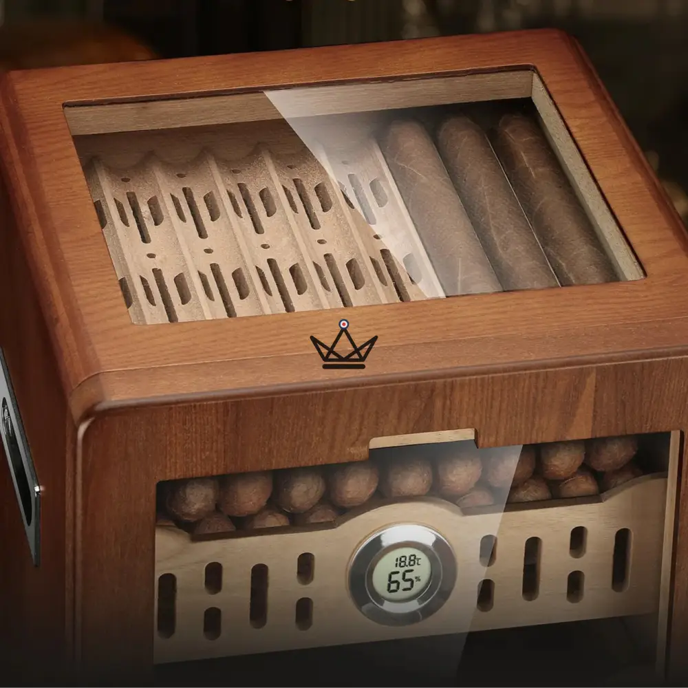 Der Vesuvius Sky zeichnet sich durch sein Glasfenster an der Oberseite aus, durch das eine obere Schublade mit 9 Fächern für Zigarren sichtbar ist. Dieses Design ermöglicht Ihnen die Präsentation Ihrer schönsten Stücke, egal ob Cohiba- , Montecristo- , Partagas- oder Romeo y Julieta -Zigarren, bei gleichzeitig kontrollierter Luftfeuchtigkeit .