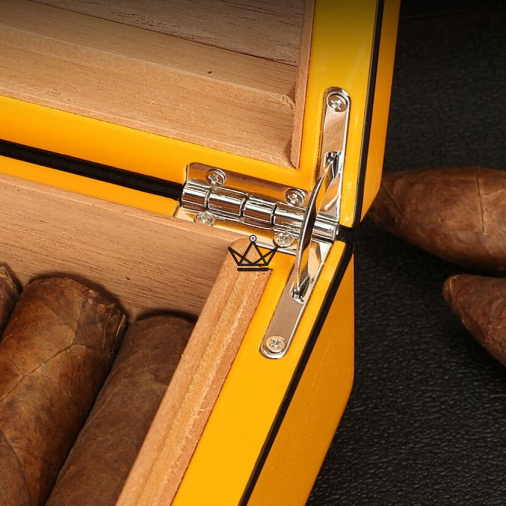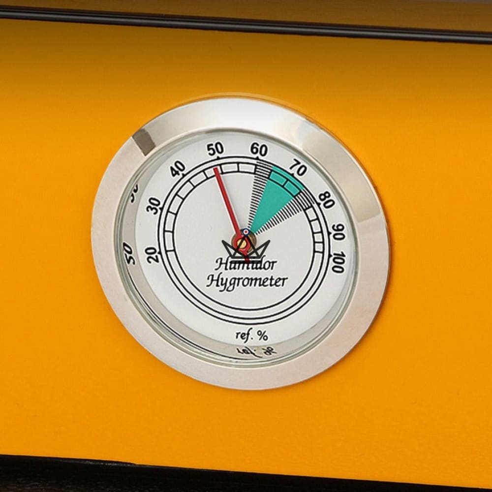 Die glänzend gelbe Oberfläche, verstärkt durch schwarze Carbonfaserstreifen, verleiht diesem Humidor ein optisch auffälliges Erscheinungsbild, das ins Auge fällt. Ausgestattet mit einem präzisen Hygrometer an der Vorderseite sorgt dieser Humidor für eine ideale Lagerung Ihrer Zigarren, indem er die Luftfeuchtigkeit im Inneren des Etuis kontrolliert.