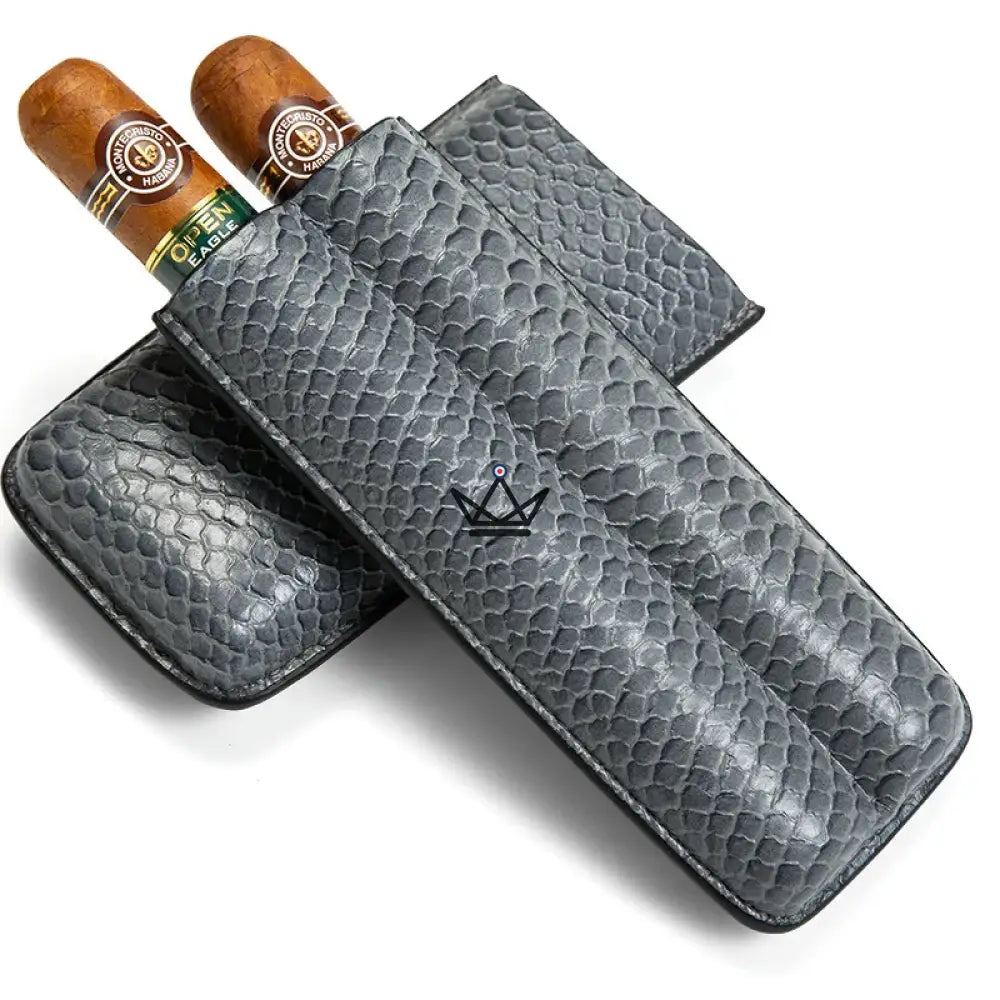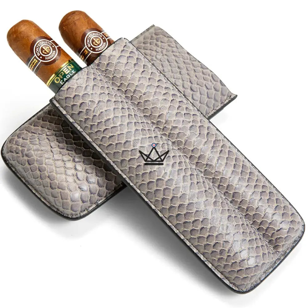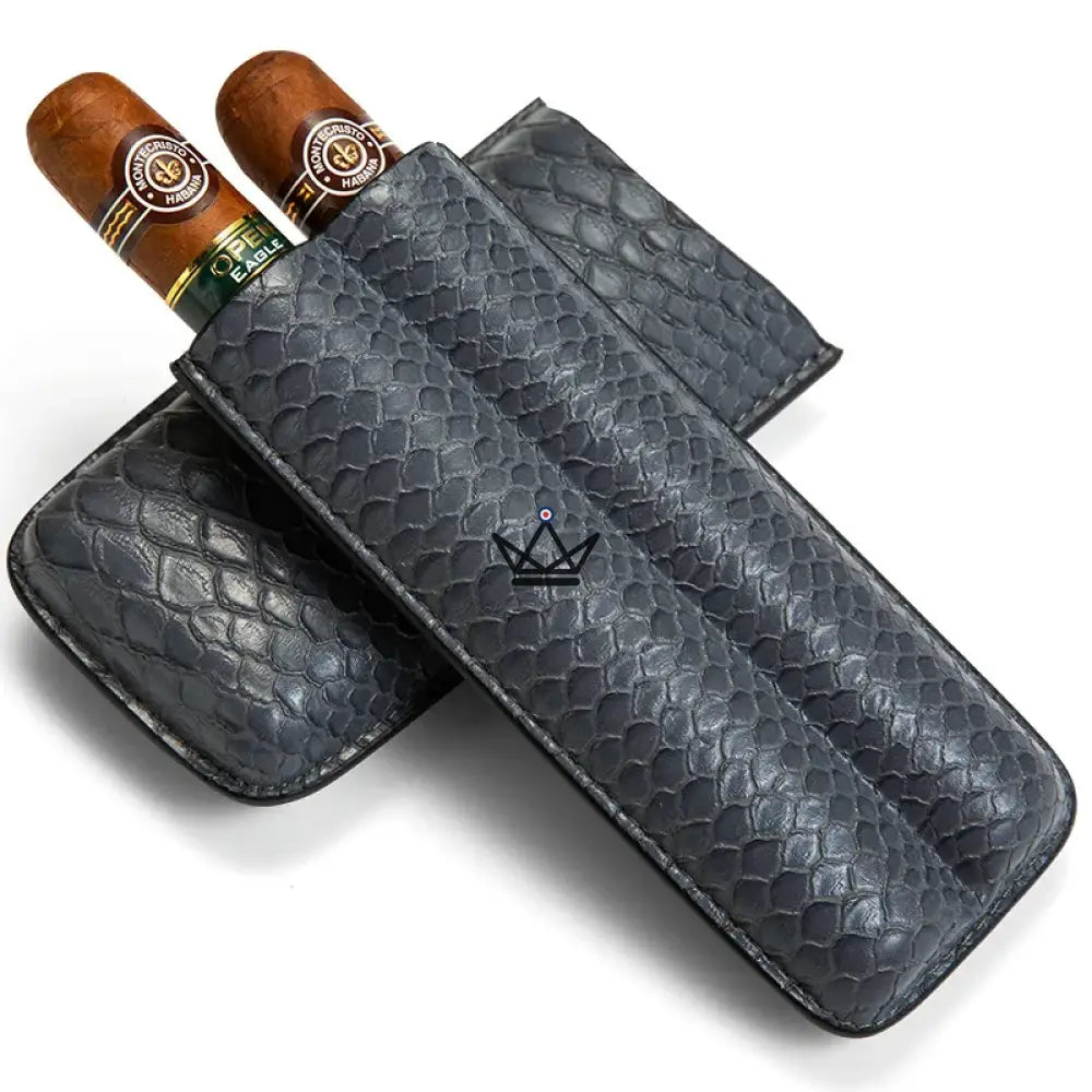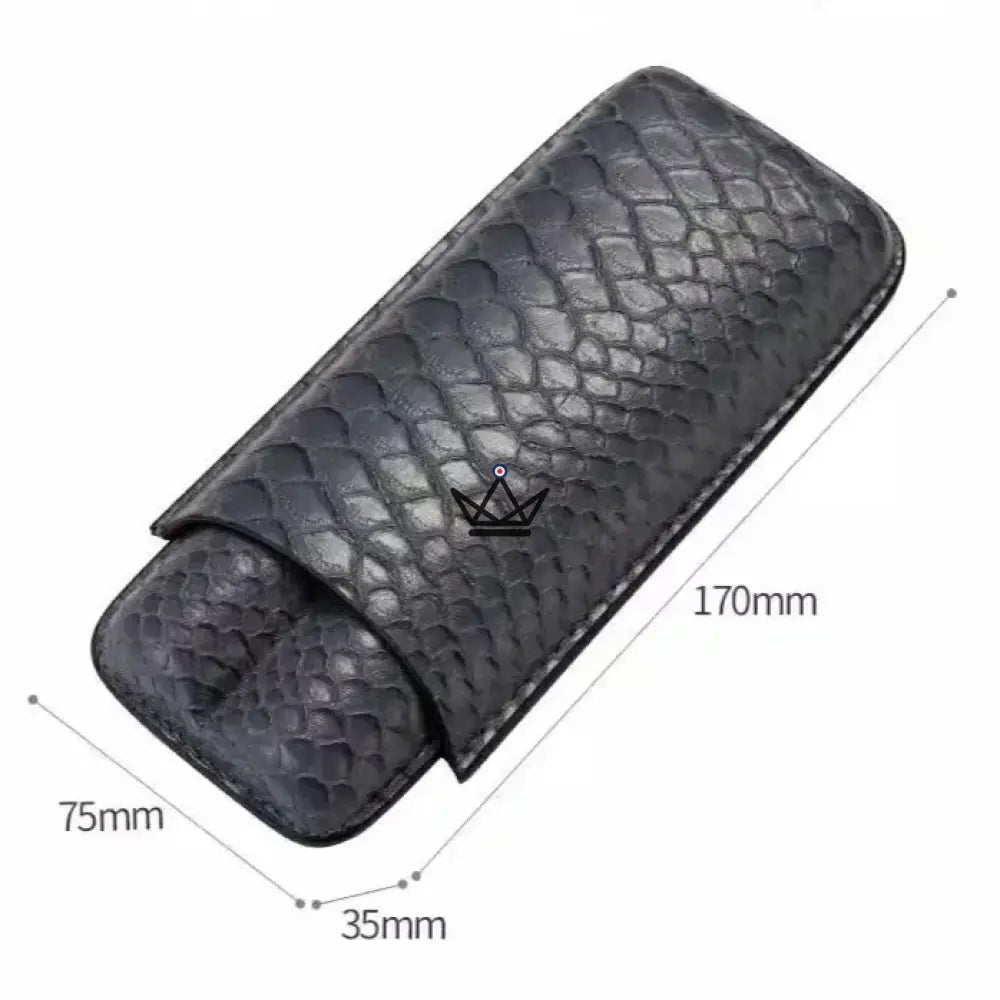 Dieses Modell ist speziell für die Aufnahme von zwei Zigarren konzipiert und bietet dank seines weichen Inneren und der robusten Struktur optimalen Schutz. Das Leder ist sorgfältig verarbeitet, um ein makelloses Finish zu gewährleisten, während die Außenseite über eine geprägte Textur verfügt, die einen Hauch von Raffinesse verleiht. Für den sicheren Transport Ihrer Zigarren verfügt jedes Etui über einen praktischen, leicht zu handhabenden Verschluss.