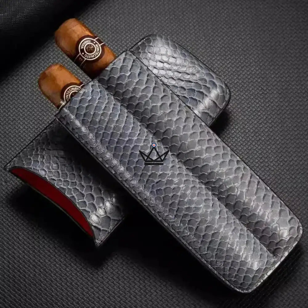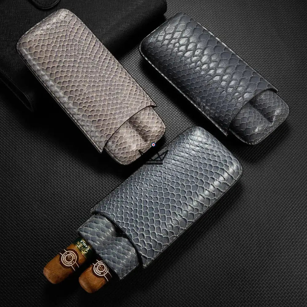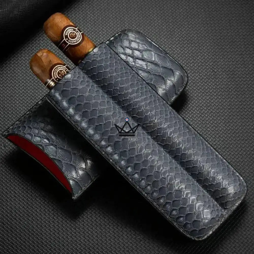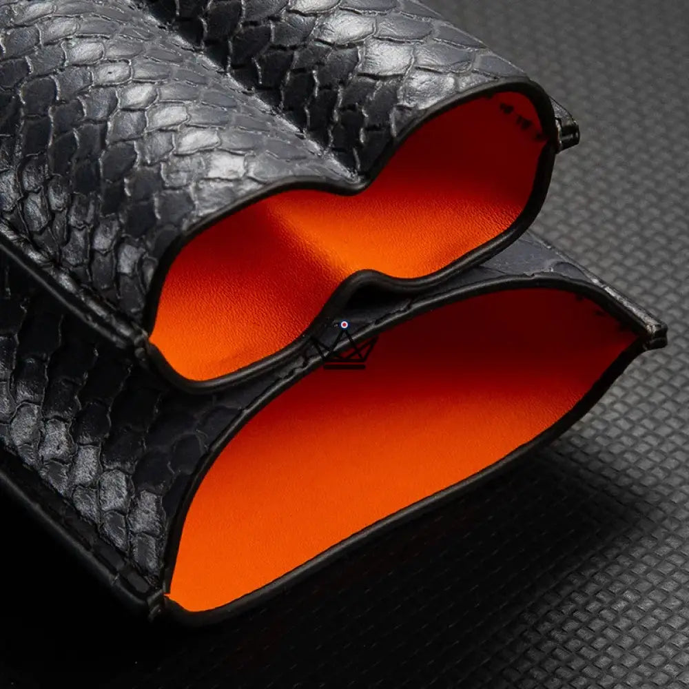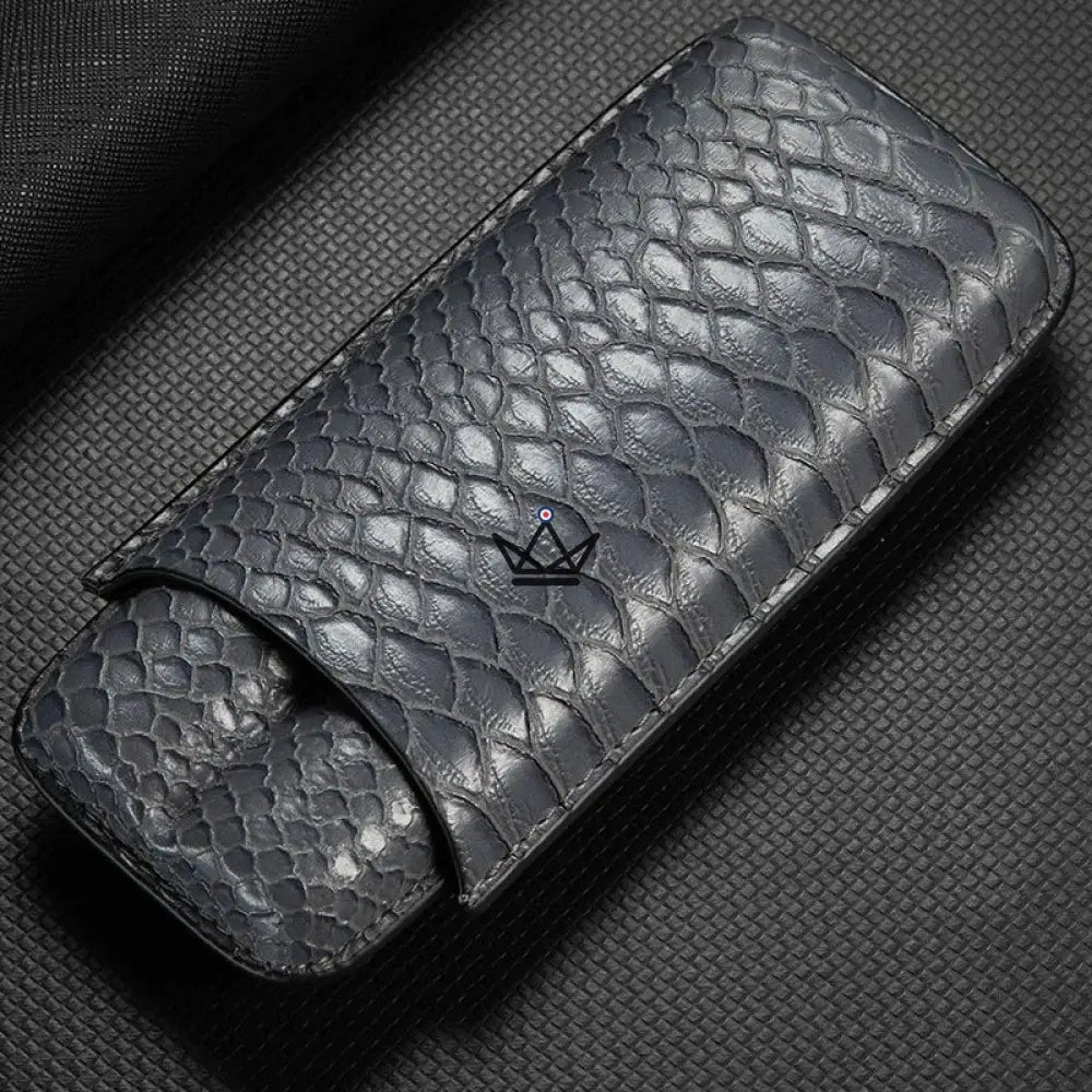 Dieses Modell ist speziell für die Aufnahme von zwei Zigarren konzipiert und bietet dank seines weichen Inneren und der robusten Struktur optimalen Schutz. Das Leder ist sorgfältig verarbeitet, um ein makelloses Finish zu gewährleisten, während die Außenseite über eine geprägte Textur verfügt, die einen Hauch von Raffinesse verleiht. Für den sicheren Transport Ihrer Zigarren verfügt jedes Etui über einen praktischen, leicht zu handhabenden Verschluss.