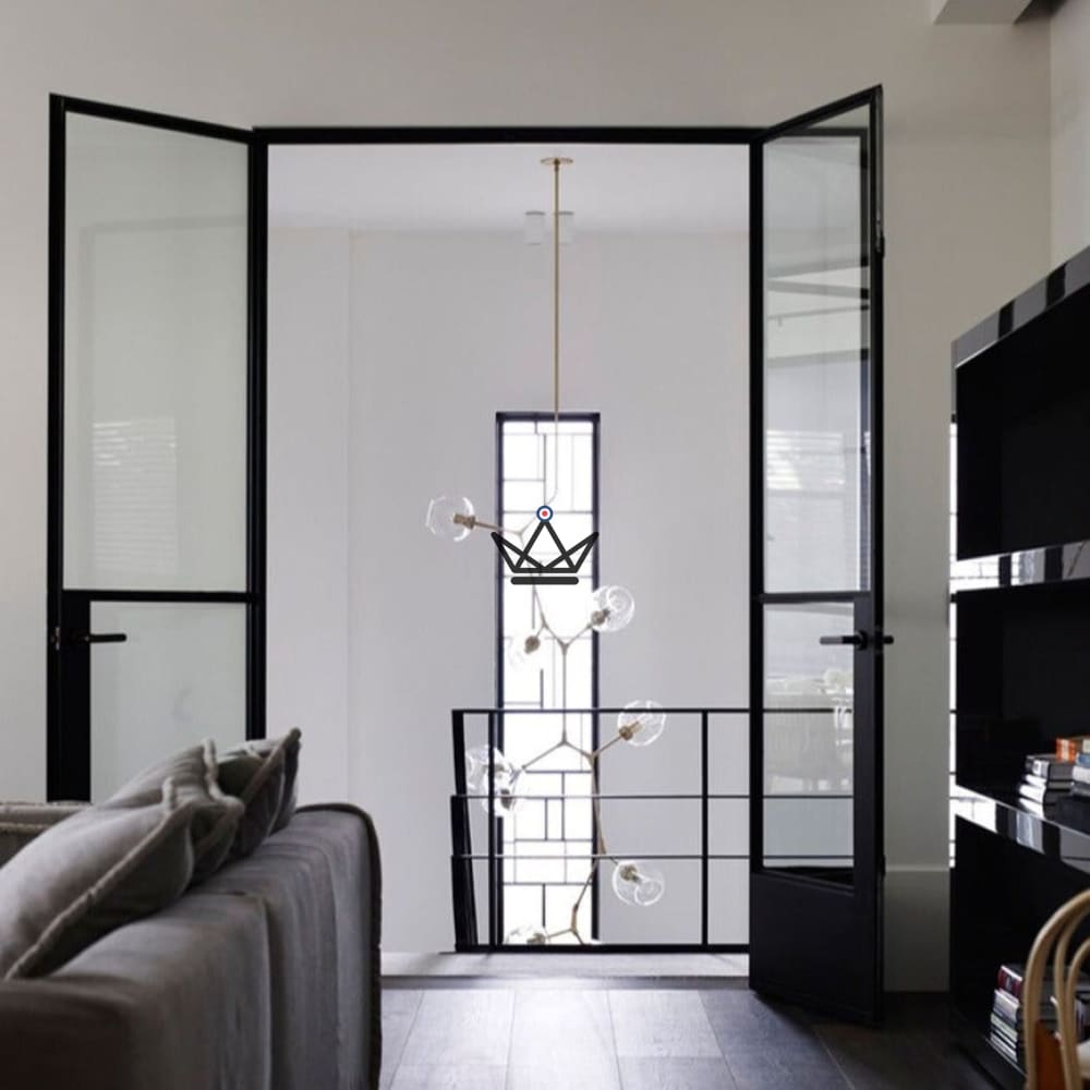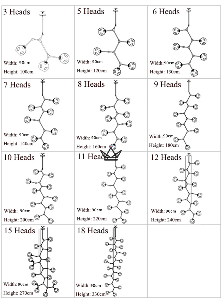 The width remains constant at 90 cm while the height varies from 100 cm for the 3-globe model up to 330 cm for the imposing 18-globe model, allowing this chandelier to adapt to ceilings of different heights.