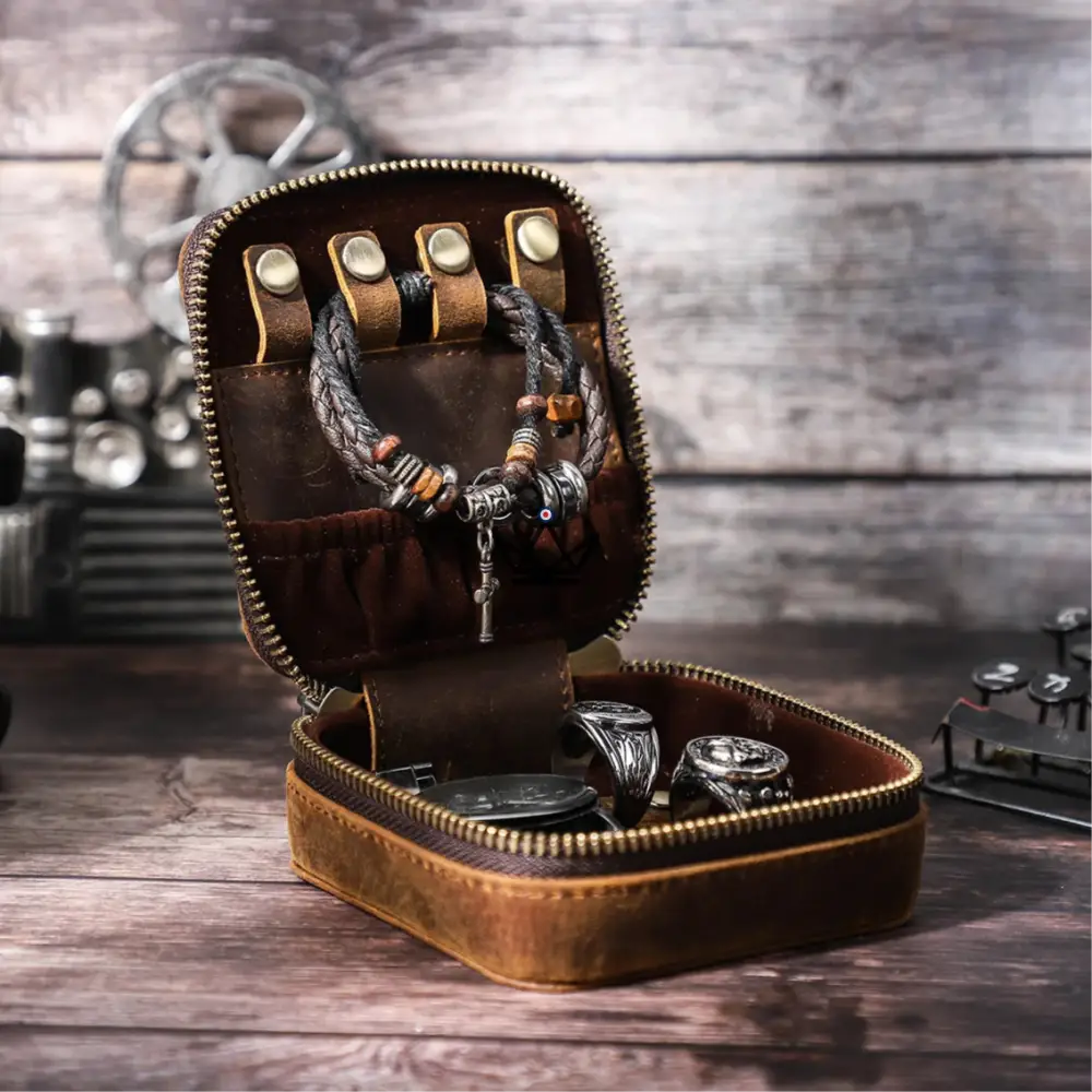 Découvrez Voyageur Nova, la boîte à bijoux en cuir pleine fleur pensée pour les voyageurs élégants et les passionnés de belles pièces. Compacte, robuste et raffinée, elle protège vos montres, bagues, colliers et bracelets dans un écrin haut de gamme lors de vos déplacements.