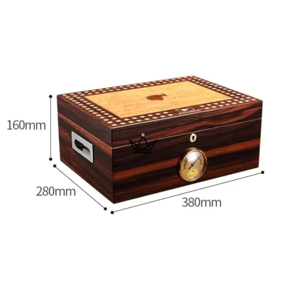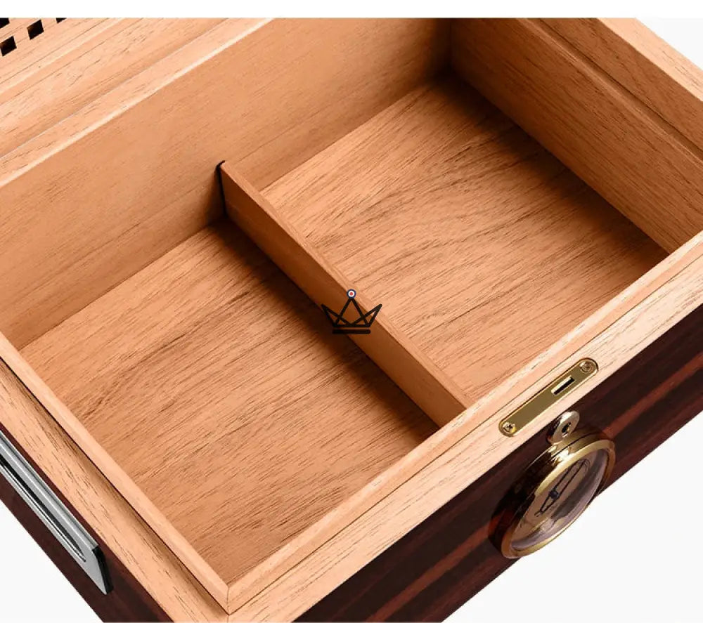 Conçue avec soin, la cave est dotée d'un intérieur en bois de cèdre espagnol, sélectionné pour ses qualités d'humidification naturelles, qui aide à maintenir une humidité constante et préserve l'intégrité de chaque cigare Cohiba, Romeo y Julietta... Au cœur de cette expérience sensorielle se trouve un hygromètre précis, délicatement encastré sur la face avant, permettant de surveiller l'humidité à tout moment sans perturber la quiétude de vos cigares.