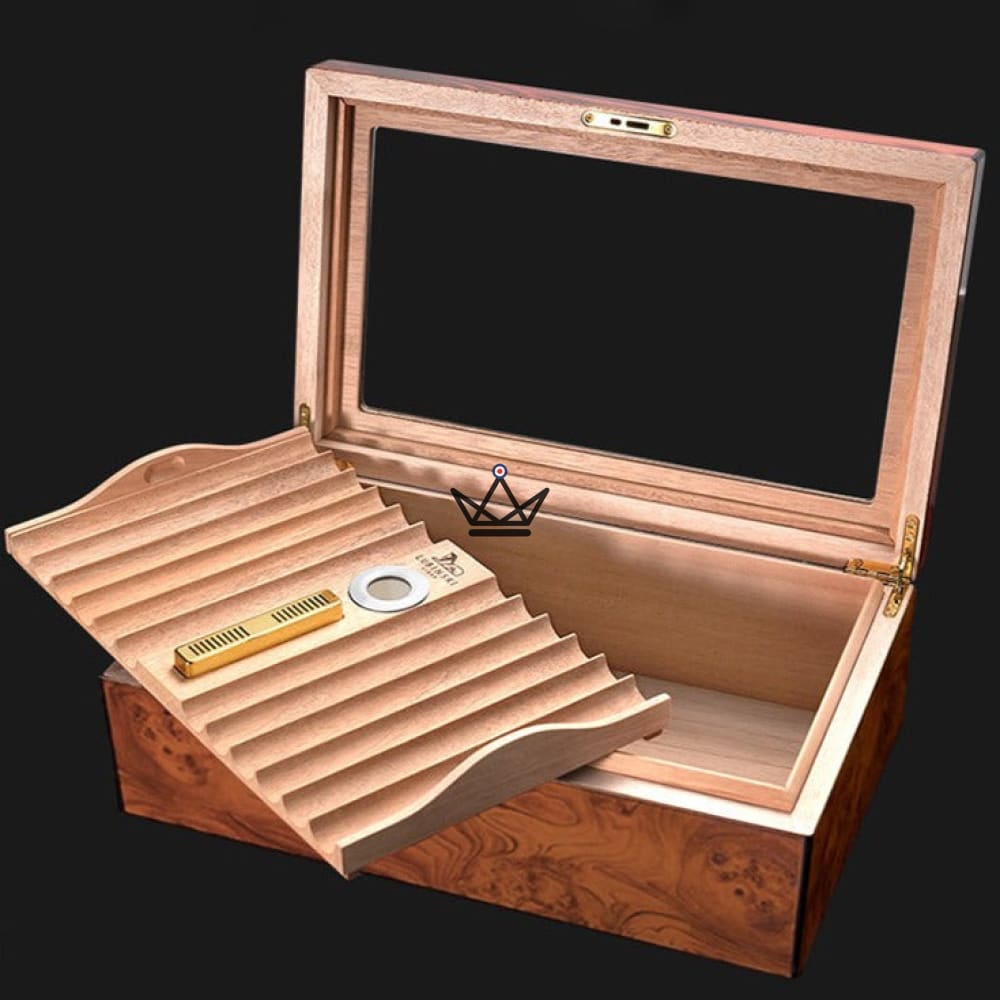Cette cave à cigares se distingue par son design élégant et royal. Son extérieur laqué ajoute une touche de sophistication et de raffinement à votre espace. L'intérieur de la cave est en bois de cèdre, connu pour ses qualités naturelles de régulation de l'humidité, ce qui permet de maintenir vos cigares dans des conditions optimales.