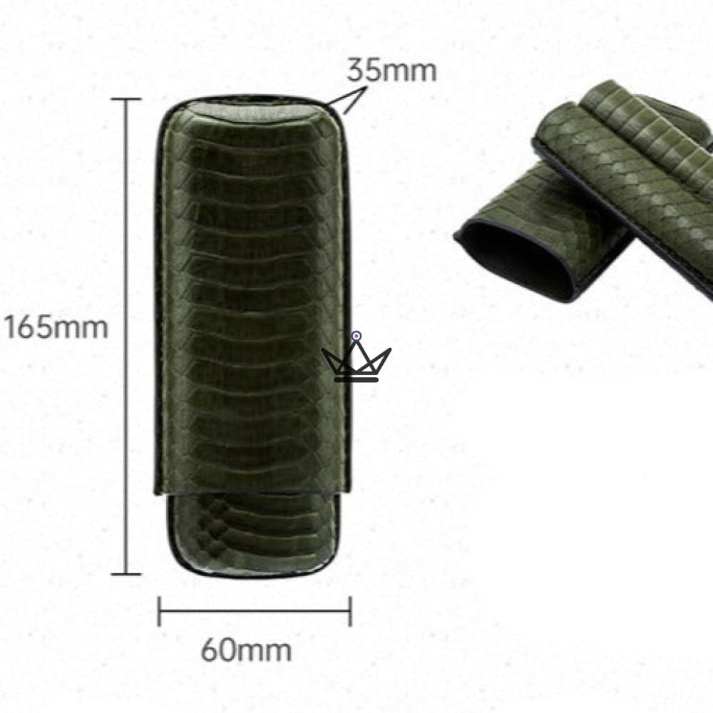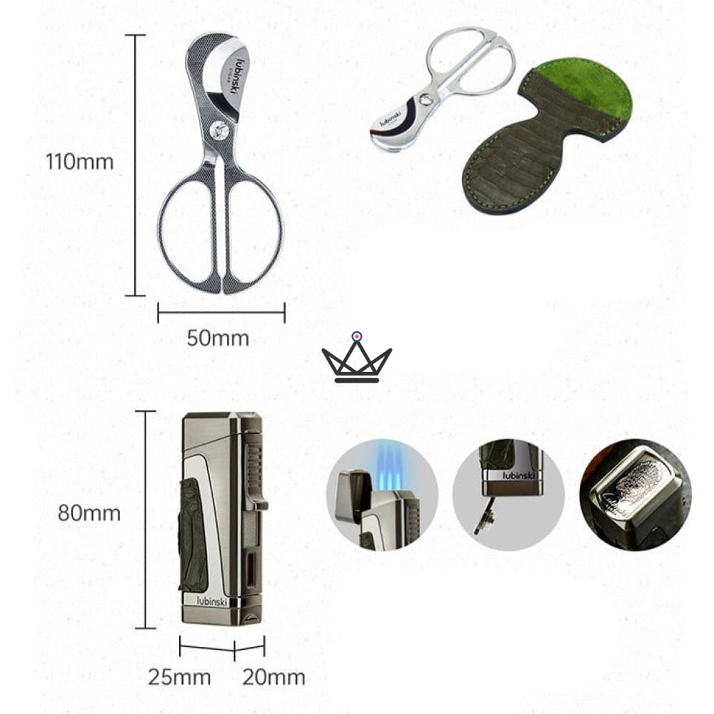 Ce coffret comprend également des accessoires essentiels. L'étui à cigares en cuir véritable vert avec motif alligator assorti à la cave garantit une protection élégante pour vos cigares en déplacement. Le briquet, doté d'un poinçon pratique, est orné d'une partie en cuir véritable vert avec motif alligator, offrant un mariage parfait de style et de fonctionnalité. Enfin, les ciseaux à cigares, accompagnés de leur étui en cuir véritable vert avec motif alligator, ajoutent une touche de sophistication à votre rituel de dégustation.