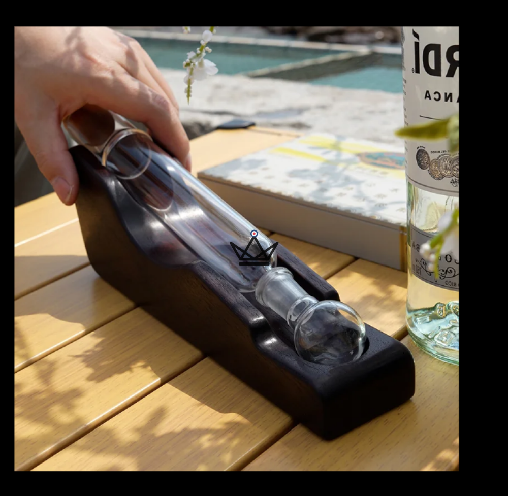 Conçu autour d’un tube en verre allongé, Infusio Axis repose horizontalement sur une base stable, offrant un support parfait pour vos plus beaux modules. À ses extrémités, deux bouchons en bois de cèdre permettent d’absorber l’humidité excédentaire tout en conservant l’arôme du cigare intact.