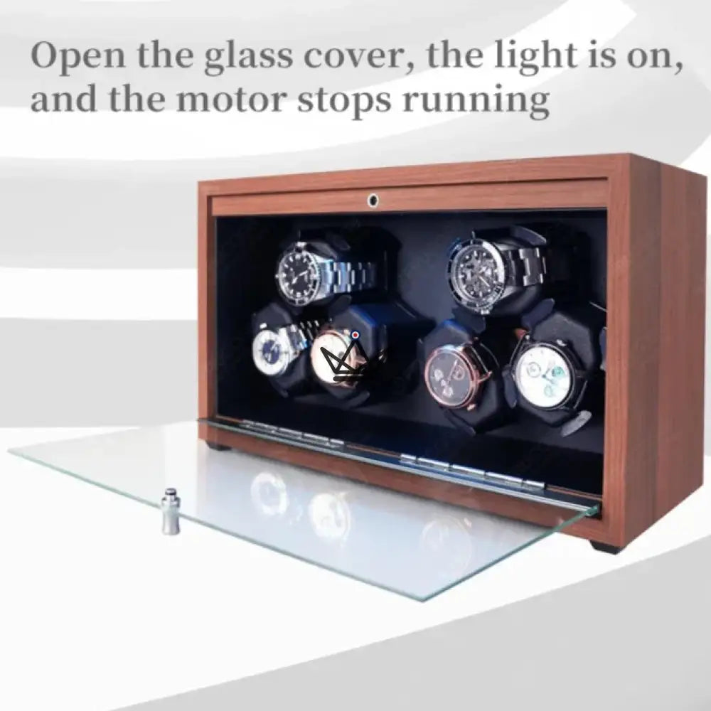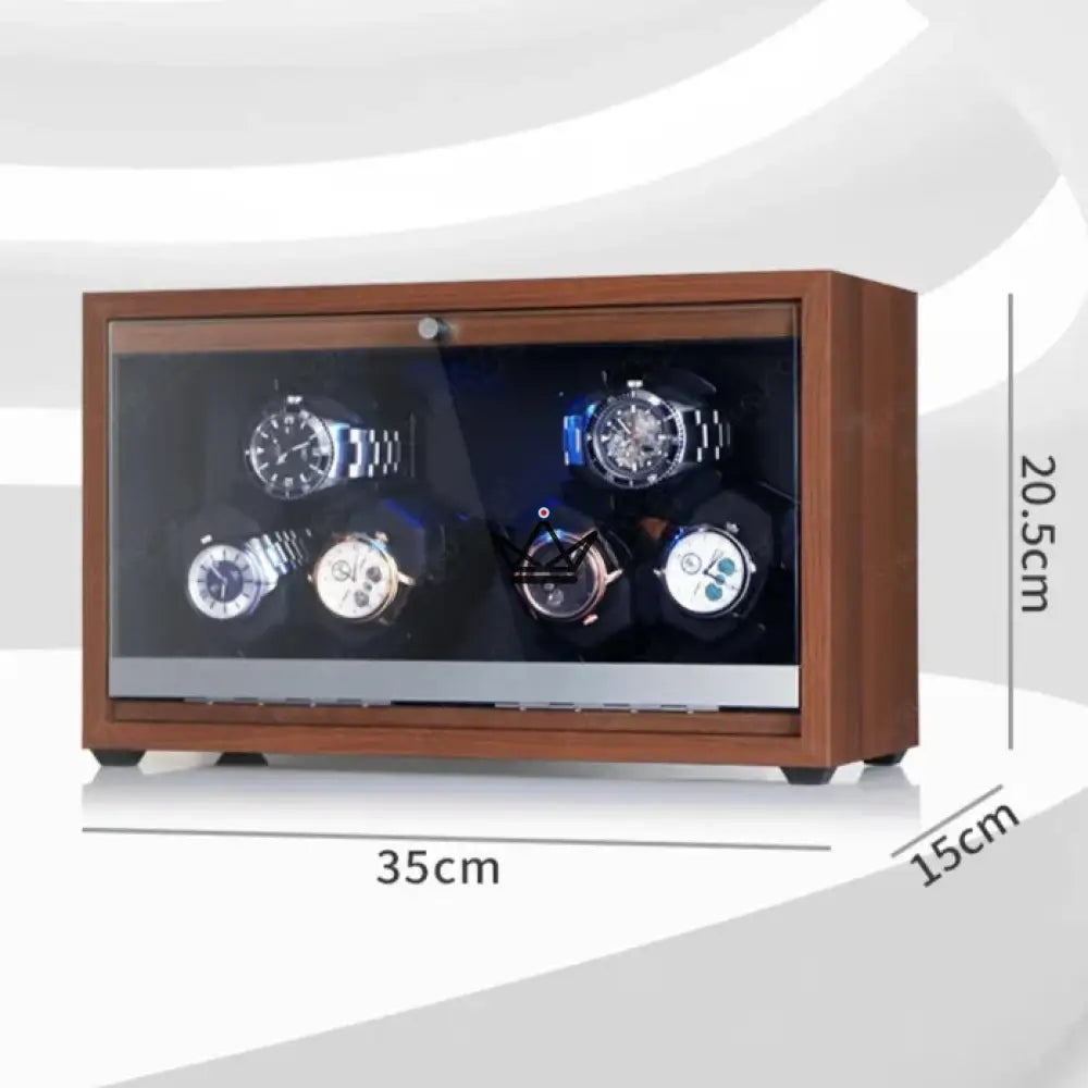 Ce remontoir dispose de six emplacements astucieusement disposés pour maintenir vos montres automatiques en parfait état de marche. Son couvercle en verre transparent permet une vue imprenable sur votre collection, tout en ajoutant une touche de sophistication à votre décor.